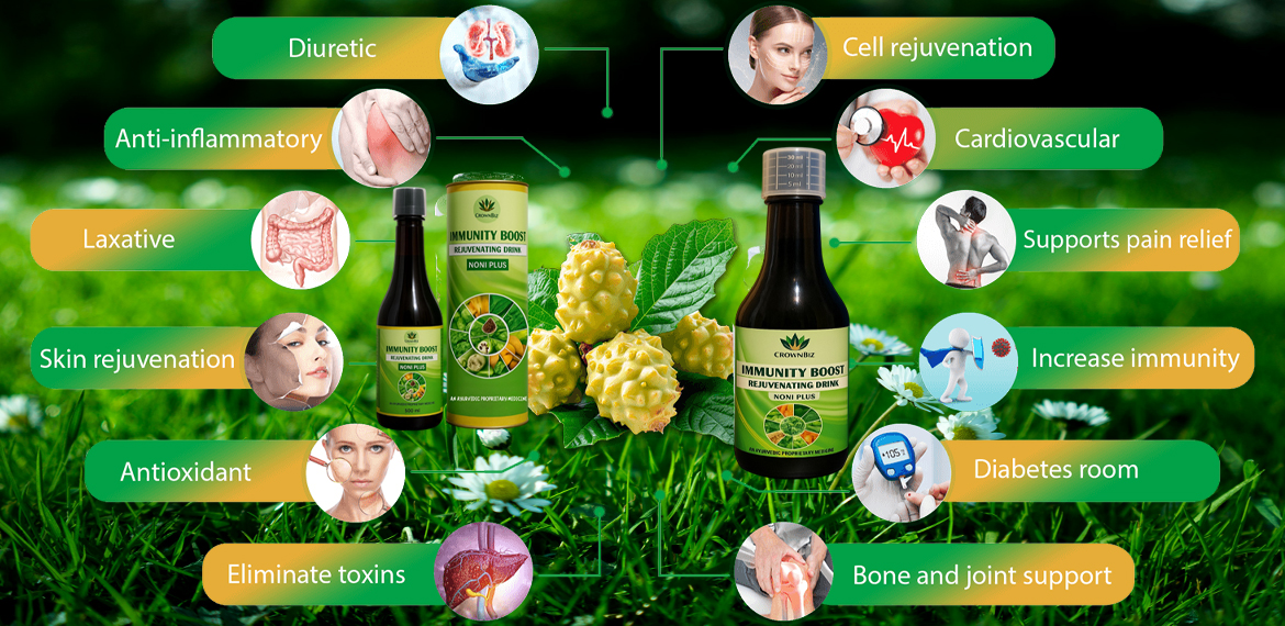 Crownbiz Immunity booster rejuvenating drink noni plus is a powerful blend of natural herbs formulated to revitalize your body and mind. It enhances energy and stamina, improve mental clarity and focus, stronger immune system, enhances digestion and detoxification etc.
